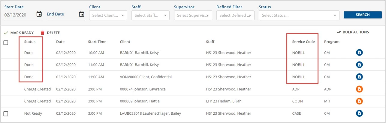 1. In the example above, the Services provided on 02/12/2020 are being reviewed. Note that the three Services with a Done Status have NOBILL for a Service Code.
