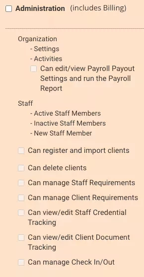 Default and Billing Permissions will also automatically enable when you select Administration Permissions. In addition to those Permissions, Administrators will be able to access Organization level settings and Staff functions.