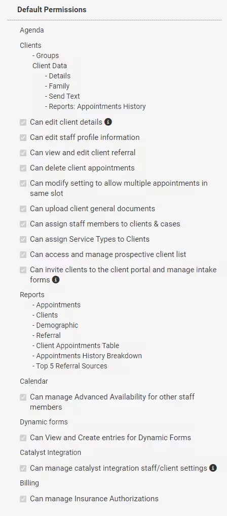 Default Permissions will also automatically enable when you select Therapist Permissions. You can manually deselect certain Default permissions if desired.