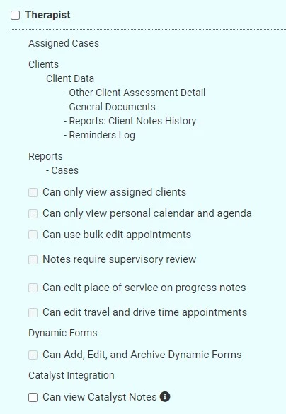 - Can only view assigned Clients - If the Therapist is not assigned to the Client, they will not be able to see that Client at all in the system. Additionally, if selected, all Client Data permissions will apply only to Client's you are assigned to.