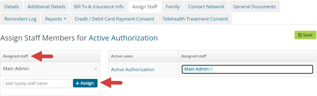 - Click +Assign to add a staff member to the Assigned staff column on the left side, if you have not already done so.