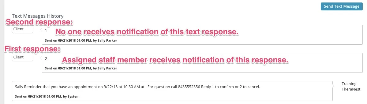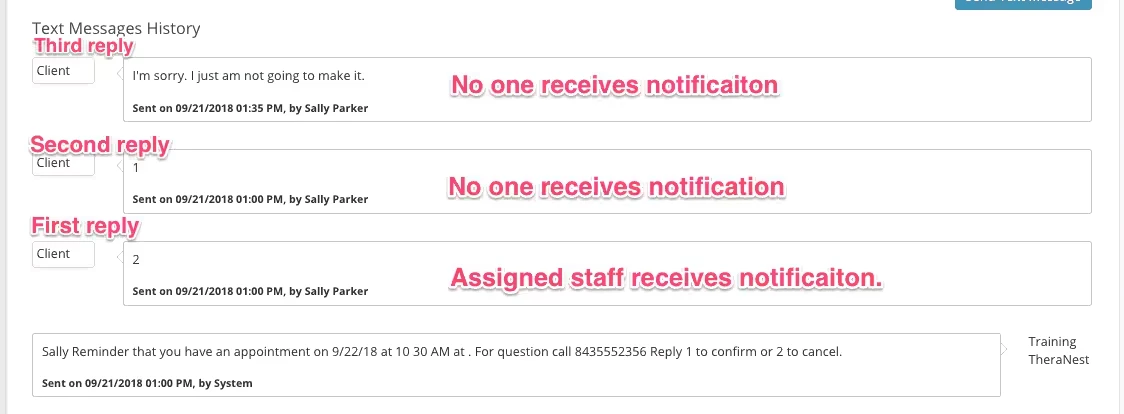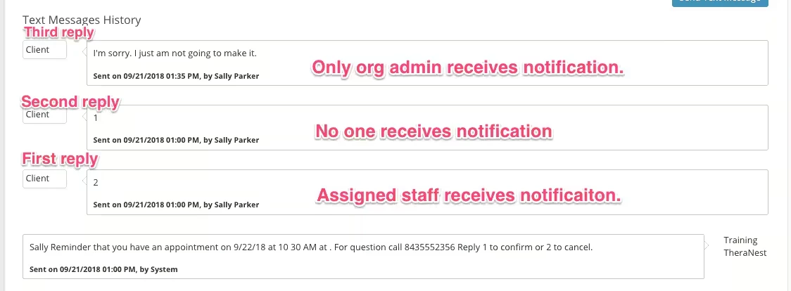 You will not receive the standard reply notifications for appointments that are not yours, but again, you will receive a text response notification for ALL non-standard replies regardless of who the staff member is on the appointment. - If you are a Therapist and not an Organization Admin it's important for you to know that you will only receive non-standard reply notifications if they are the FIRST response to a reminder.