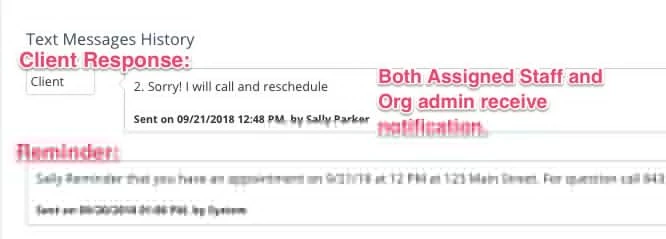 - If the client sends another message after this with a non-standard message, the org admin will only receive an SMS alert that the client has sent a non-standard reply; the message is added to the reminders log.