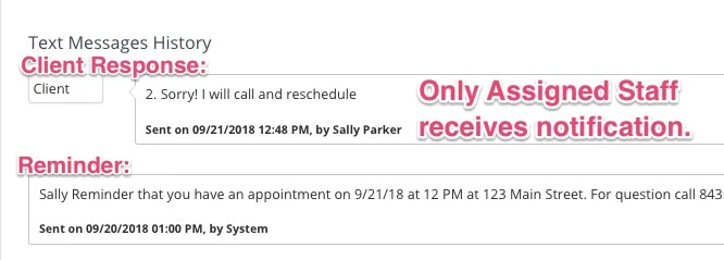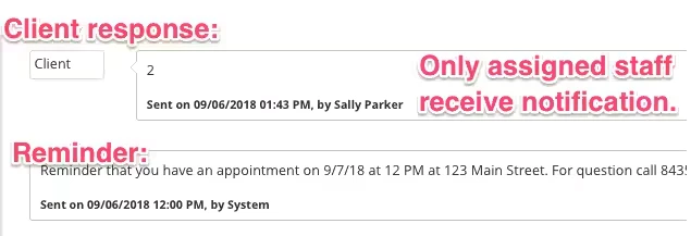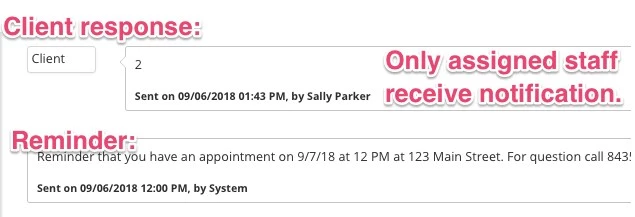 - IF the first response after the text appointment reminder is non-standard (free text message), THEN the assigned staff receives an SMS alert that the client sent a non-standard message; the message is added to the reminders log.