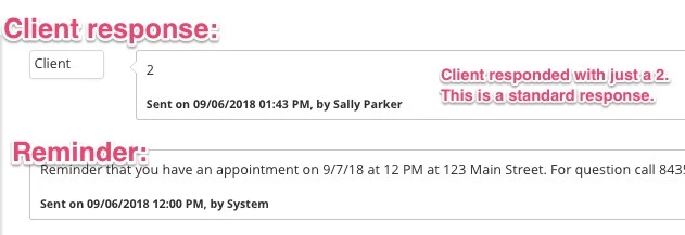 - Confirms an appointment via a reminder - Client responds with a standard reply, a "1" to confirm the appointment.