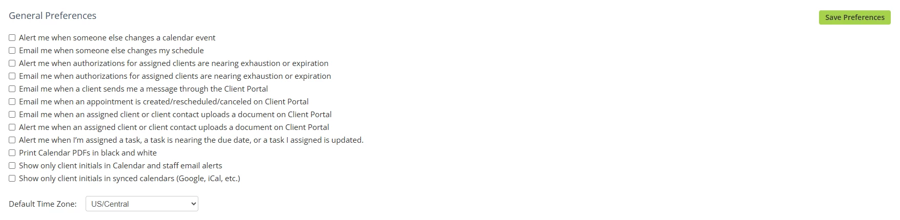 Default Time Zone allows you to select a default time zone that is different from the organization & location time zone settings. It will display on the system calendar, agenda, & appointments. All signed documentation will still reflect the organization's time zone, and client-facing reminders will reflect the location time zone.