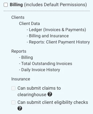 Default Permissions will also automatically enable when you select Therapist Permissions. You can manually deselect certain Default permissions if desired.