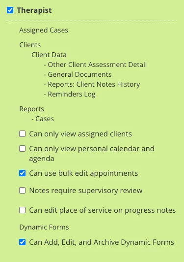 - Can use bulk edit appointments - When selected, Therapist will have the ability to use the bulk edit appointments feature.