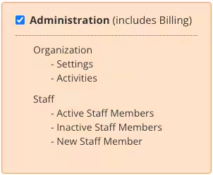 Default and Billing Permissions will also automatically enable when you select Administration Permissions. In addition to those Permissions, Administrators will be able to access Organization level settings and Staff functions.