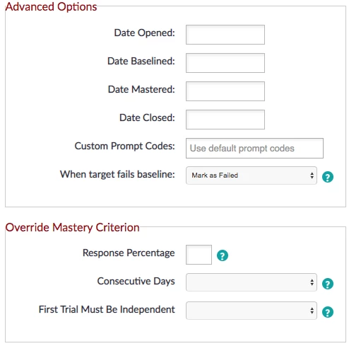 - First trial must be independent- If set to Yes, the first trial of each consecutive day (as defined by Consecutive Days) MUST be independent. If set to No, only other criteria are used to determine mastery.