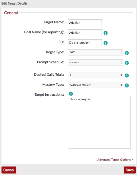 - Mastery Type- Select Automatic Mastery to define mastery criteria and automatically move Targets following their mastery. Or, select Manual Mastery to have the Target included indefinitely until the user manually masters out the Target in Actions.