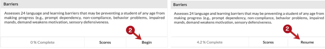- Barriers is the first section on the right side of the screen. Click the Begin button to begin scoring the section or the Resume button to continue scoring an assessment in progress.