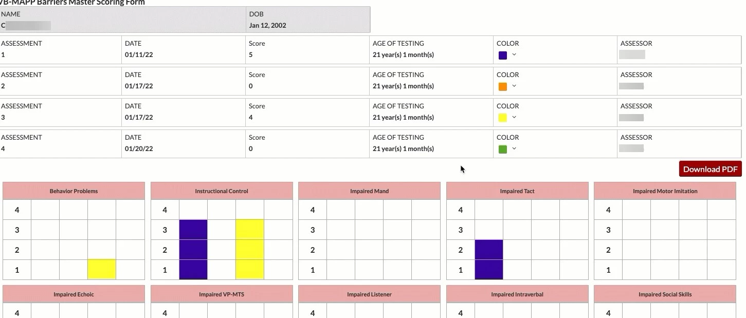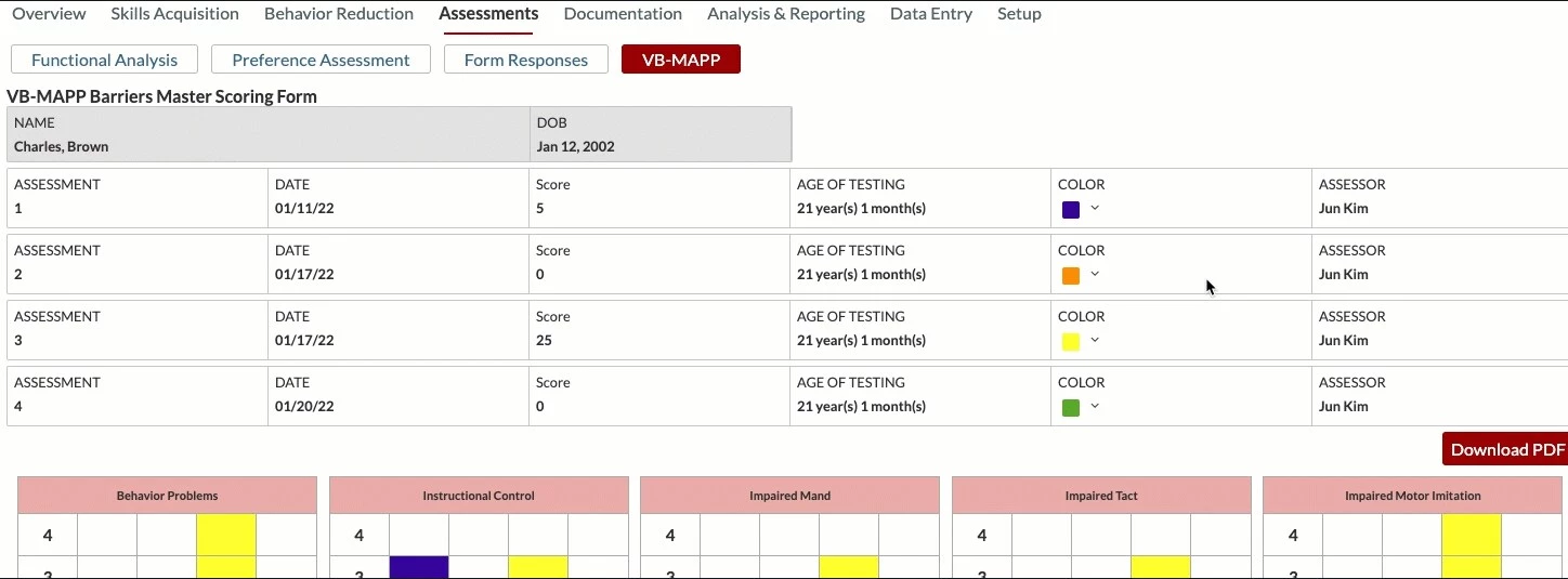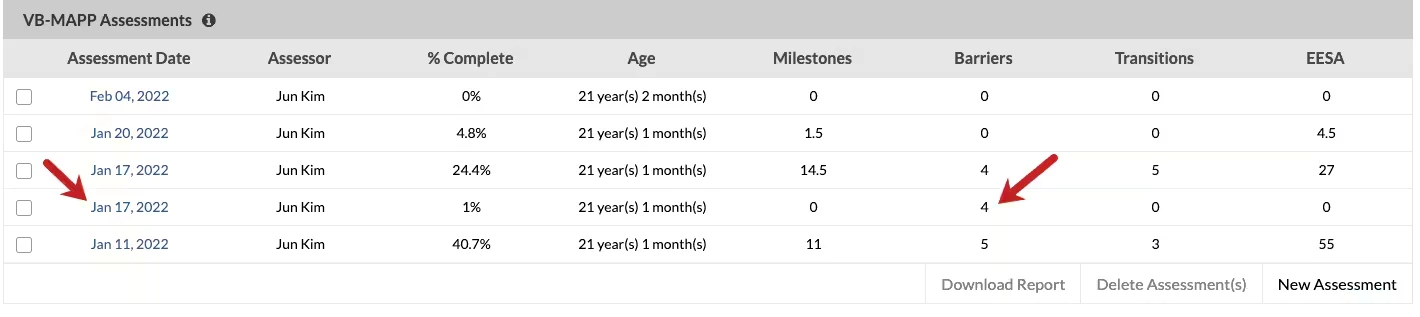 - Each measurement shows the scores entered for the student.Assessments are numbered in the grid (1st, 2nd, 3rd, 4th, etc.) and are based on the order they were entered on the main VB-MAPP table.