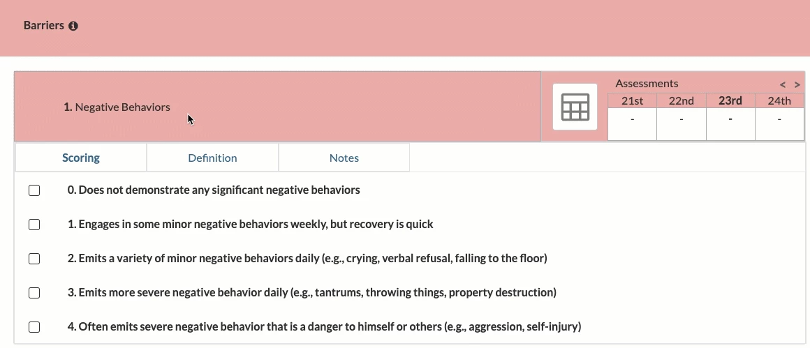 Score the assessment according to the appropriate criteria for the client. - As measurements are scored, the score appears in the assessment grid next to the measurement.