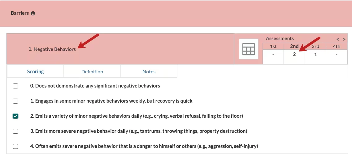 For example, the score for the measurement (Negative Behaviors) for the 2nd assessment is 2.