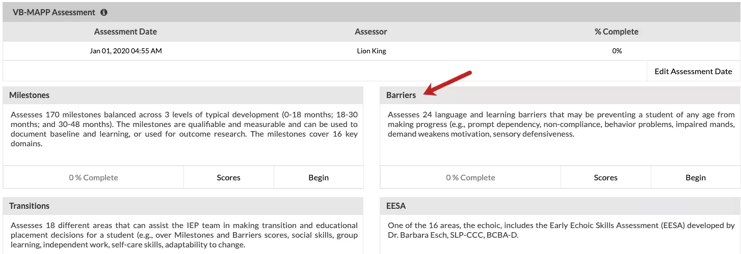 - Click the assessment date link on the main VB-MAPP page. The assessment opens.