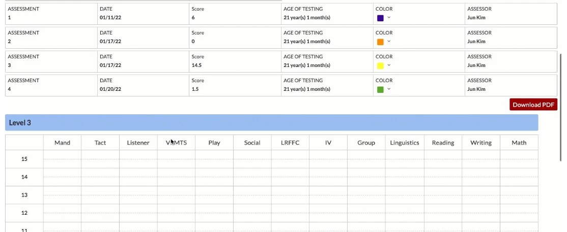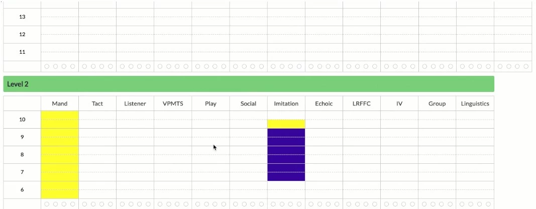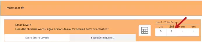 - Each level shows the total score populated for that level, which is based on how many points have been entered for each level. All of a level's total scores are added together for each domain to get an overall milestones score. Assessments are numbered in the grid (1st, 2nd, 3rd, 4th, etc.) and are based on the order they were entered on the main VB-MAPP table. For example, the total score for the 2nd assessment for level 1 here is then added into the overall milestones score here, which is the 2nd assessment entered on the main table in the second screenshot. When you open an assessment from the table it automatically opens that assessment.