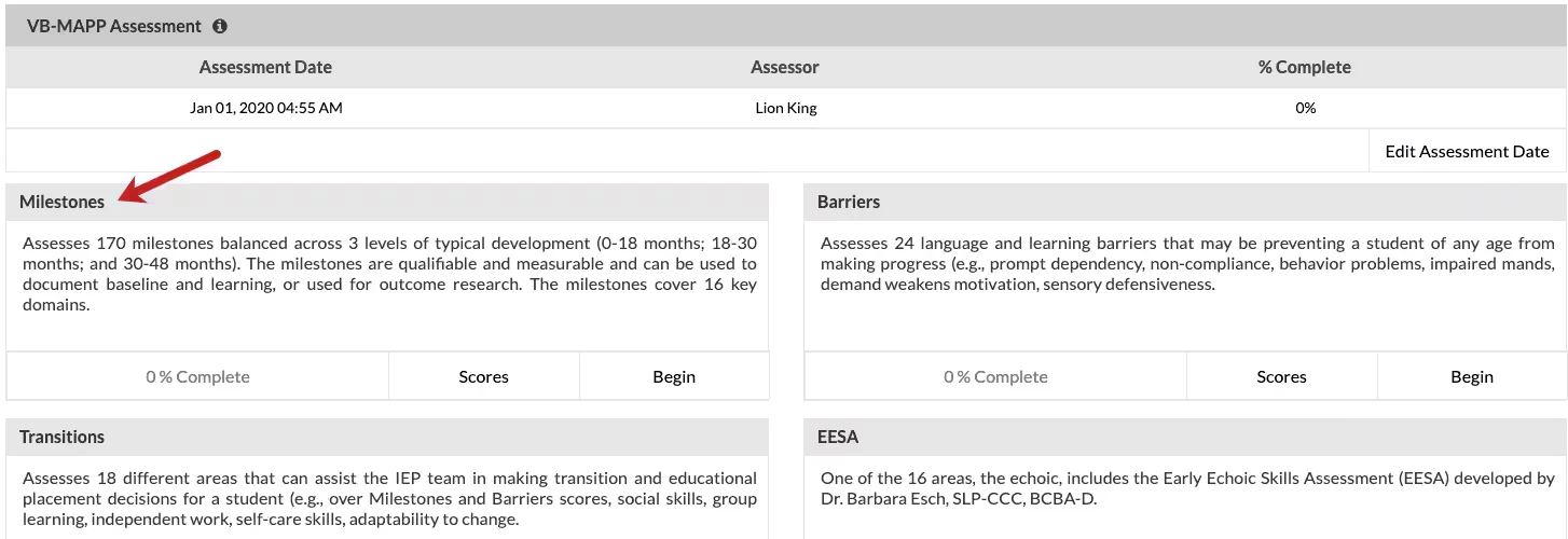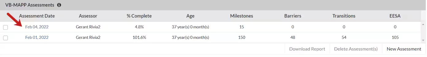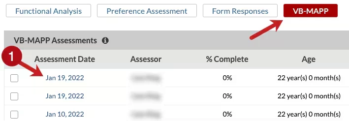 - Click the assessment date link on the main VB-MAPP page. The assessment opens.