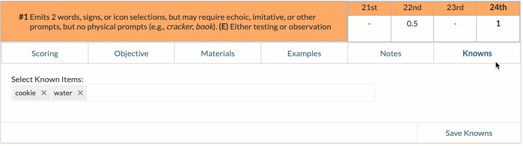 - Knowns - list already mastered known targets pertaining to that measurement for the student