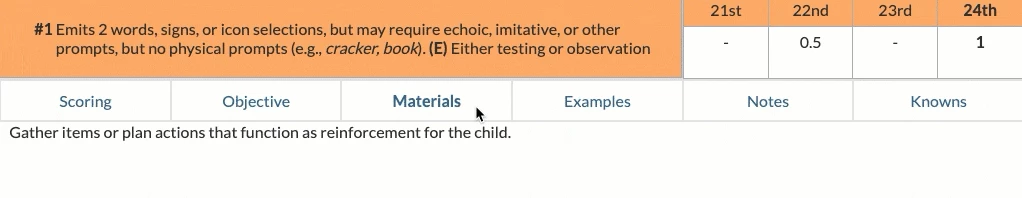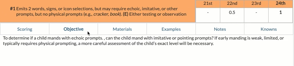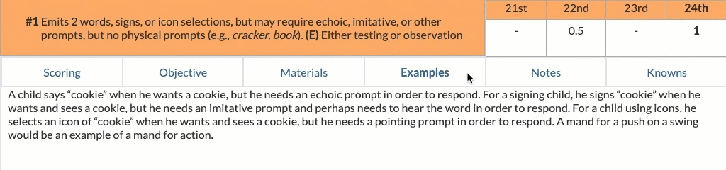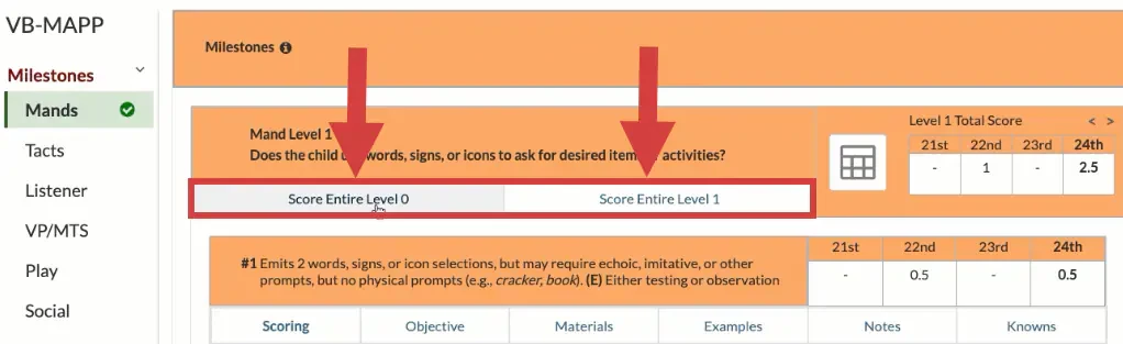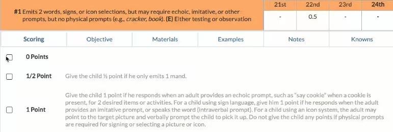See Chapter 2 > Methods of Measurement & Scoring the VB-MAPP Milestones Assessment Forms in the VB-MAPP Guide to learn more about scoring the milestones section.