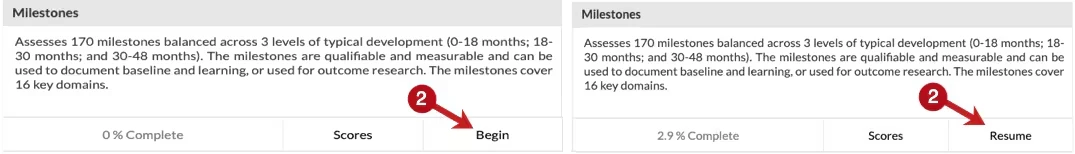 - Milestones is the first section on the left side of the screen. Click the Begin button to begin scoring the section or the Resume button to continue scoring an assessment in progress.