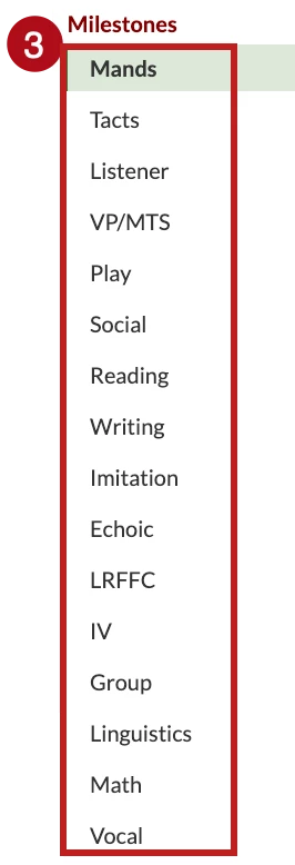 - There are 16 Milestone domains that are presented in developmental sequence: Mands, Tacts, Listener, VP/MTS, Play, Social, Reading, Writing, Imitation, Echoic, LRFFC, IV, Group, Linguistics, Math, and Vocal.