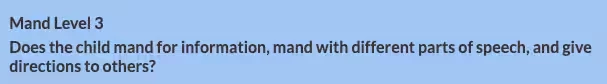 - See Chapter 5 > Mand - Level 3 in the VB-MAPP Guide to learn more about this level.