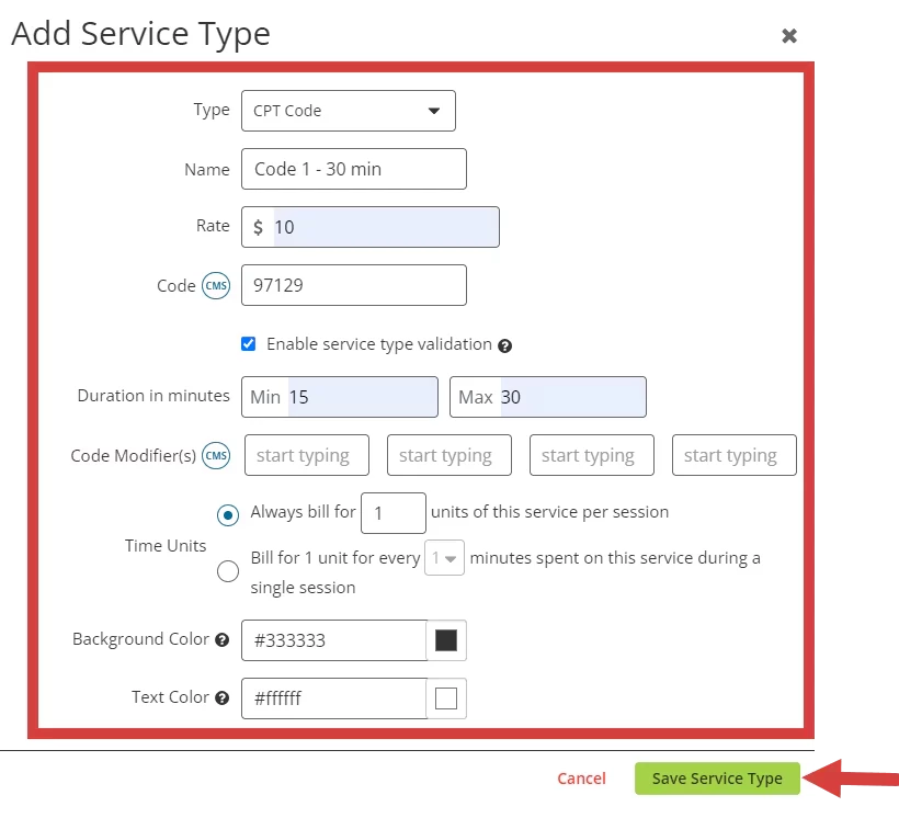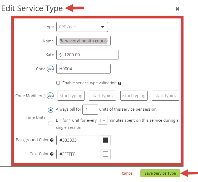 IMPORTANT: Service Type CPT Codes (including modifiers) are hard-coded. Therefore you would need a separate Service Type for each CPT/modifier combination. If you are billing to more than one payer, you can create Service Types for each payer.