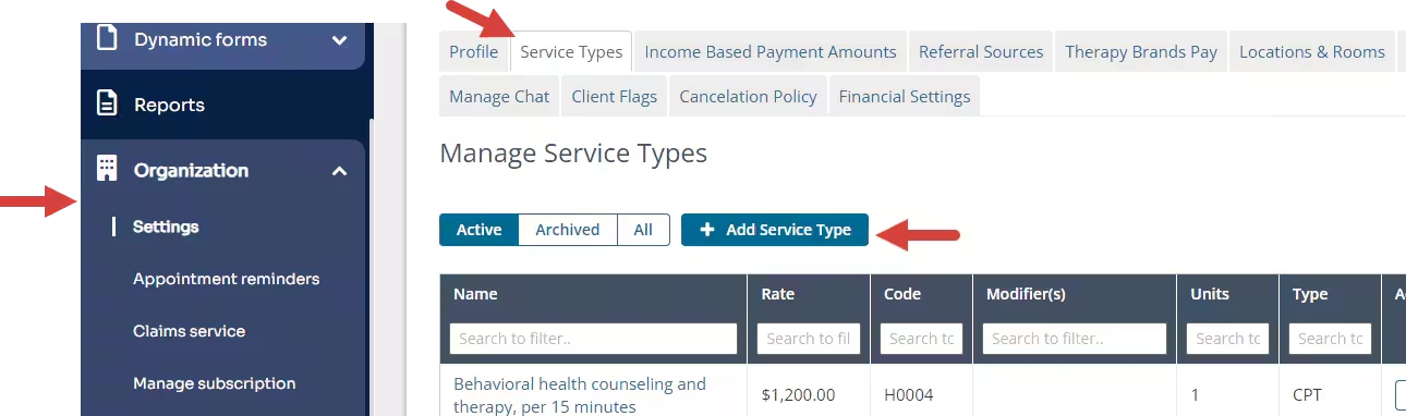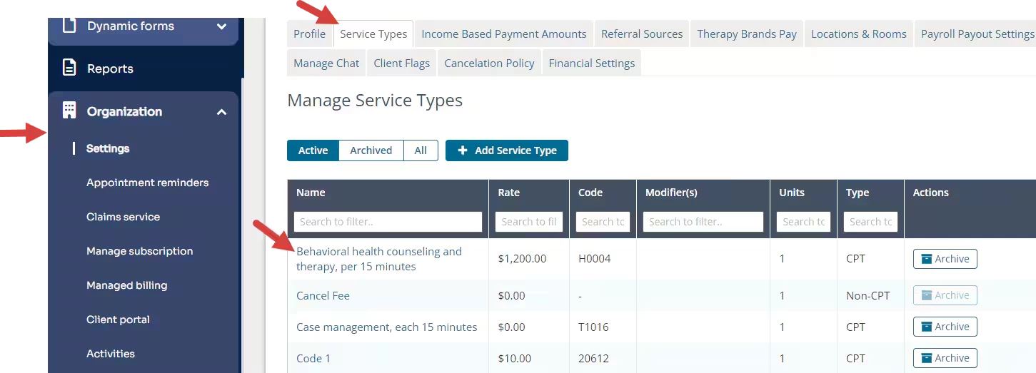 Create your Organization's commonly used Service Types using CPT Codes, as well as their Rates. Service Types cannot be deleted, but can be archived if they are no longer used.